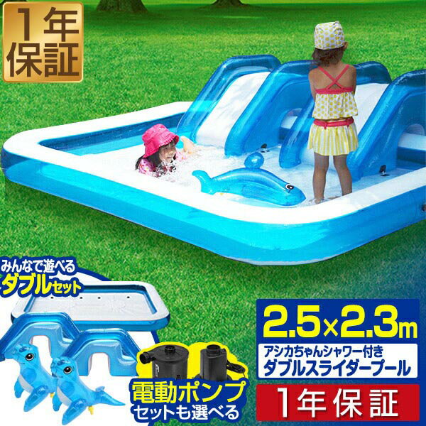 ※[店舗管理用 URL]a04612※[品番]【ブルー/プールセットのみ:a09344】【ブルー+電池式ポンプ(+1,430円):a04613】【ブルー+AC電源ポンプ(+1,760円):a04612】【ブルー+充電式ポンプ(+2,640円):a17335】【ピンク/プールセットのみ:a09345】【ピンク+電池式ポンプ(+1,430円):a04615】【ピンク+AC電源ポンプ(+1,760円):a04614】【ピンク+充電式ポンプ(+2,640円):a17336】 ご好評のアシカちゃんプールの大型サイズが登場! 250cmにも及ぶビッグサイズのプール サイズが大きくなっただけではなく、滑り台が2台、アシカちゃんも2匹付属! お友達を呼んで、みんなでプール遊びを楽しめます! プールの定番すべり台!子供はみんな大好き、プールに欠かせない 滑り台が2台ついています。